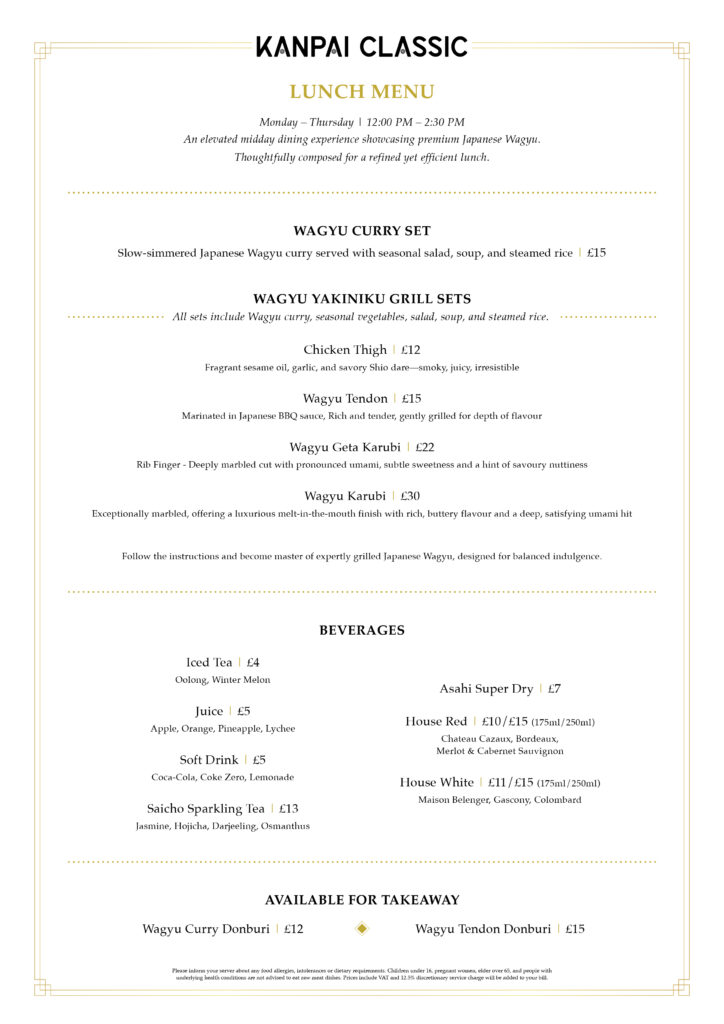 - Wagyu Karubi Set | £30 The ultimate midday luxury. Experience the legendary melt-in-your-mouth texture of our most prized marbled Wagyu.